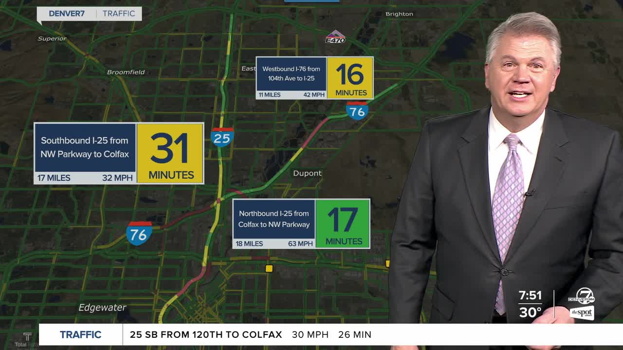 Eastbound 40th Street at Harrison is closed, DPD said. Denver7 Traffic Expert Jayson Luber said the traffic impacts are minimal to morning commuters.