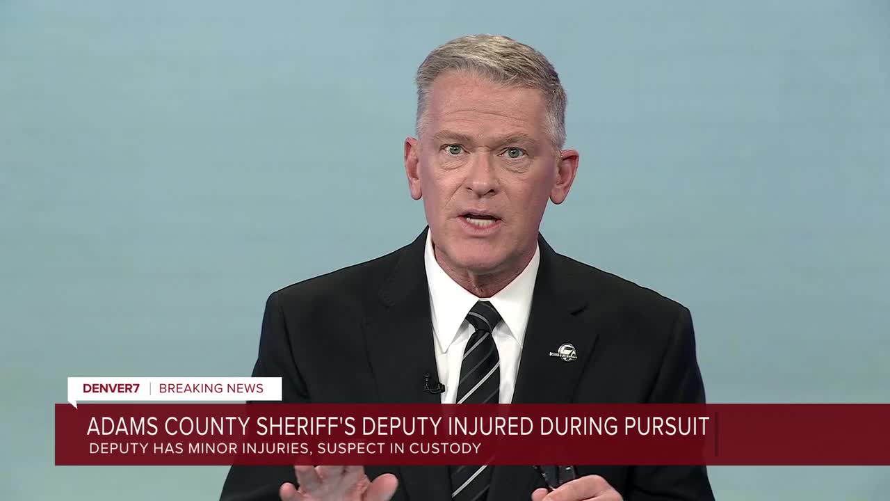 ADAMS COUNTY, Colo. — An Adams County deputy suffered from minor injuries after a suspect drove into him early on Thursday evening, the sheriff's office said.