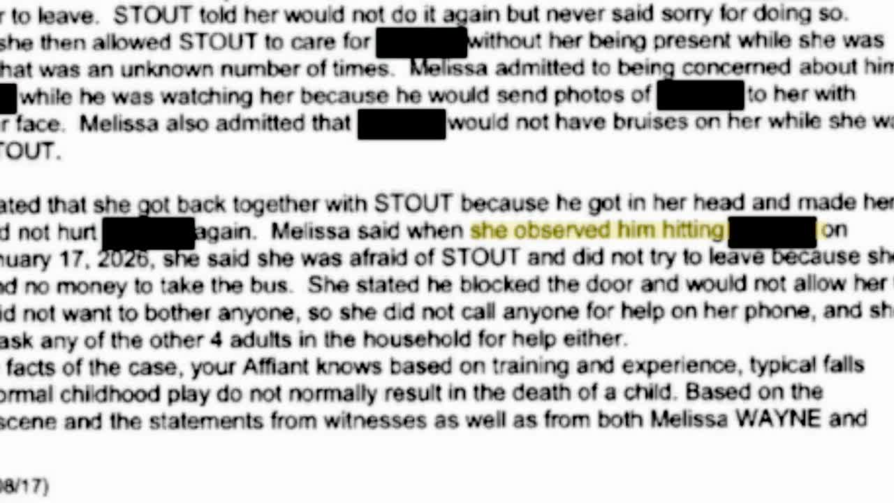While details about the cause of the child's death have yet to be released, the court documents state Stout blamed the child’s injuries on multiple falls. This contrasts with witness statements to police, alleging Stout was aggressive toward the child and that “smacking sounds” were often heard coming from the bedroom.