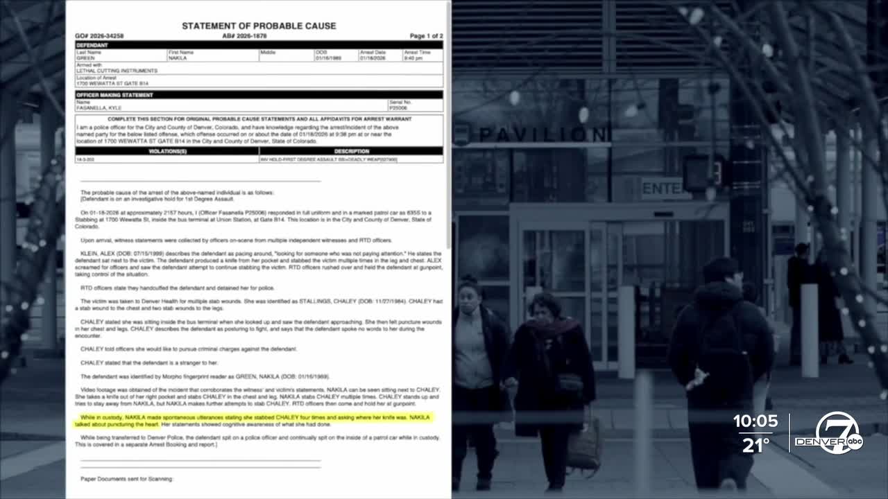 DENVER — A woman facing assault charges after allegedly stabbing her victim repeatedly at the Union Station bus terminal in downtown Denver over the weekend “talked about puncturing” the woman’s heart as she was being arrested, an affidavit obtained by Denver7 Tuesday shows.