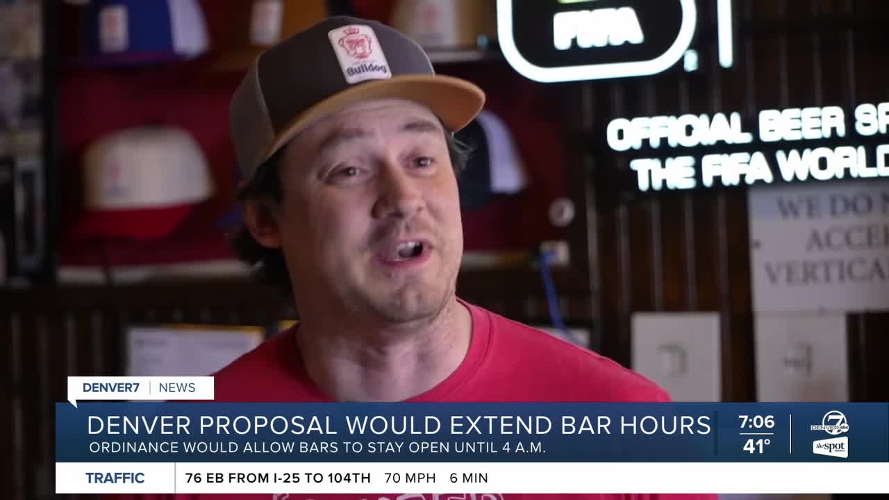 DENVER — Late nights in Denver could soon get a little longer. A proposal from the city would change licensing in Denver to push back bar closing times from 2 to 4 a.m. It would not allow bars to sell alcohol past the 2 a.m. cutoff time. That would require change to state law.