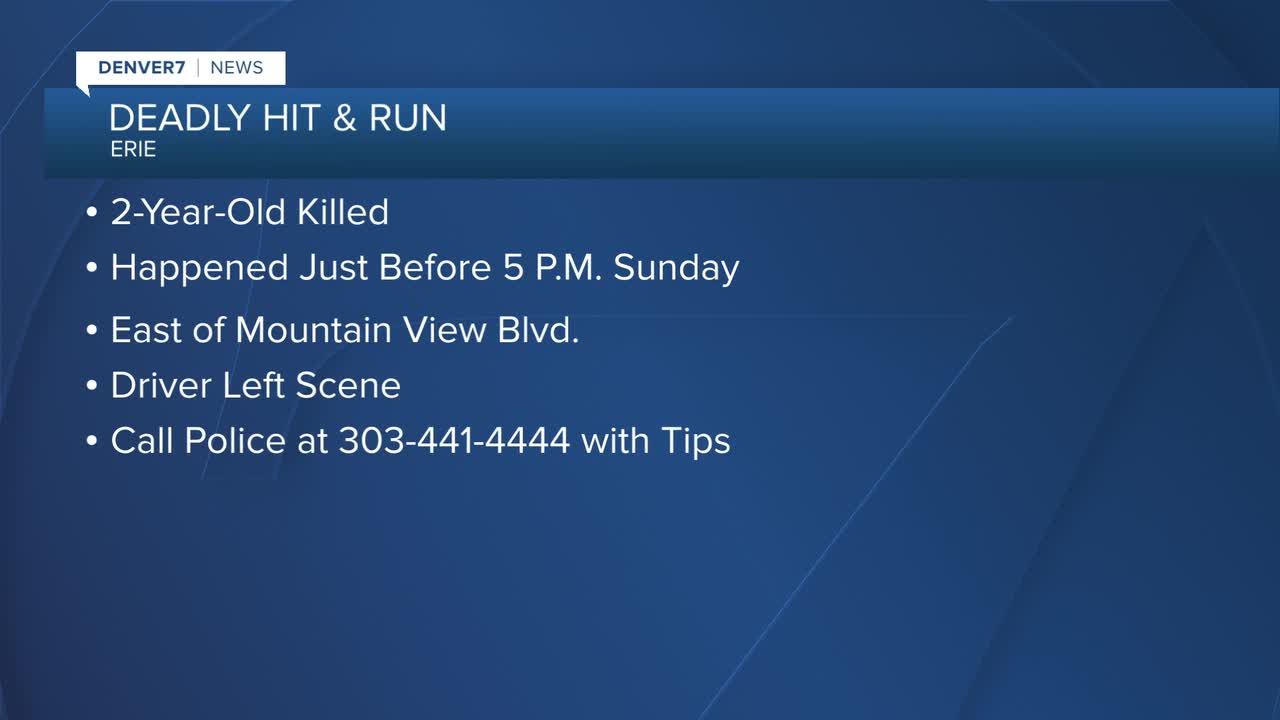 ERIE, Colo. — A 2-year-old died in a hit-and-run crash on Sunday afternoon, according to the Town of Erie Police Department.