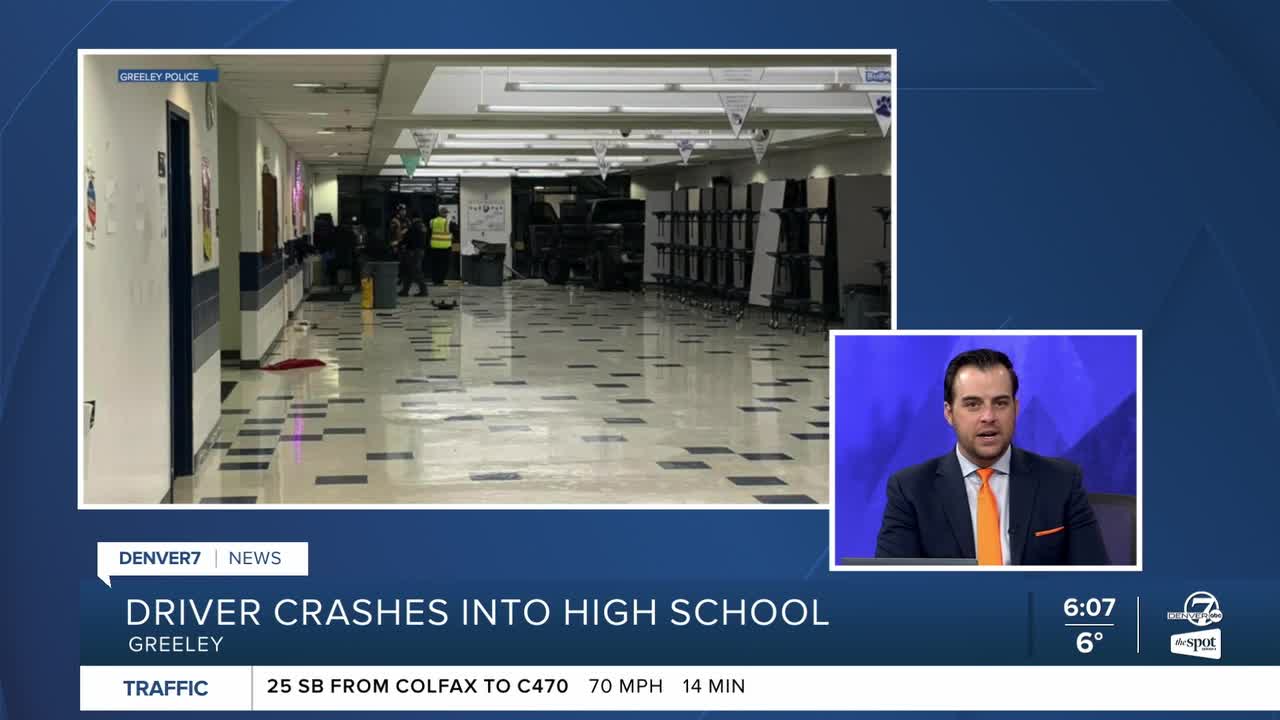 Around 8:55 p.m. Thursday, Greeley police said someone driving a truck hit the front of the building, traveled down a corridor and crashed at the end of a school hallway.
