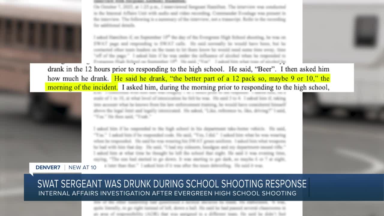 JEFFERSON COUNTY, Colo. — A Jefferson County SWAT sergeant admitted to drinking “the better part” of a 12-pack of beer hours before responding to the shooting at Evergreen High School, documents obtained by Denver7 Thursday evening show.