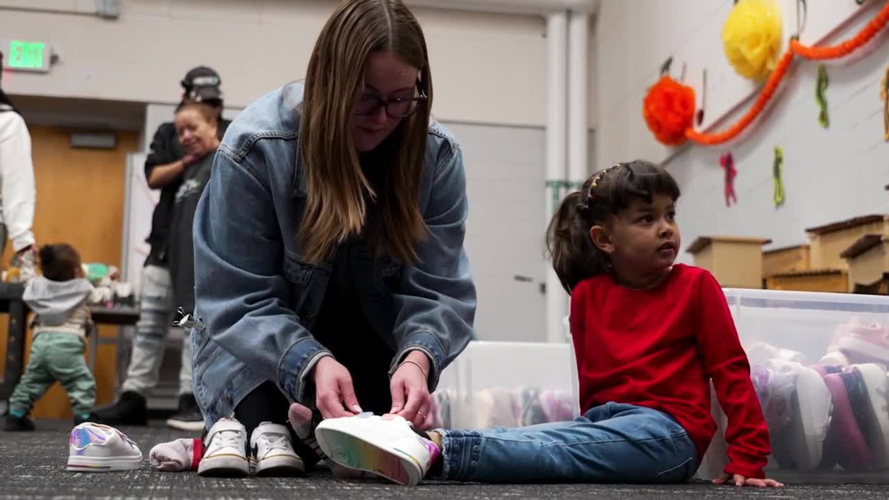 DENVER — At Valverde Elementary School, Friday morning looked a little different. The gym had been transformed into a shoe store filled with bright colors, smiling faces, and bins of brand-new shoes. Preschool and kindergarten students at the southwest Denver school got to pick out a new pair of shoes and socks, free of charge.