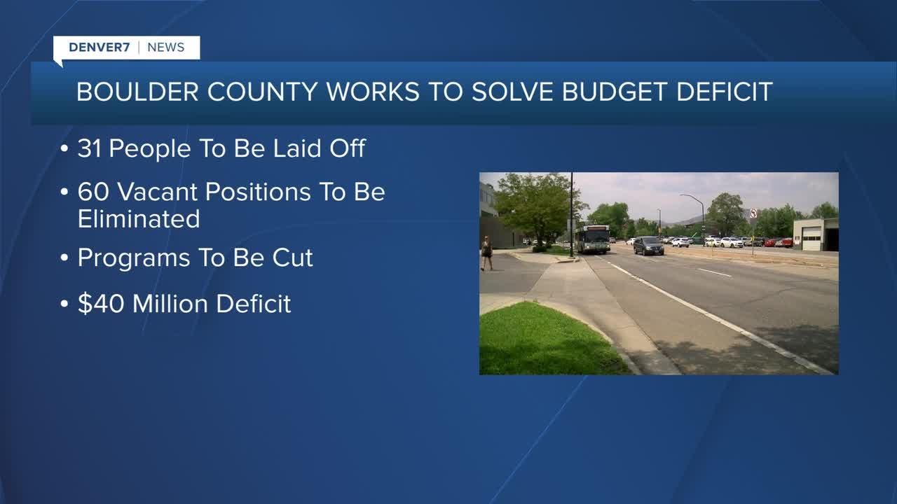BOULDER COUNTY, Colo. — Boulder County on Monday announced it will lay off 31 people and eliminate 60 vacant positions as it works to close a multi-million dollar budget shortfall.