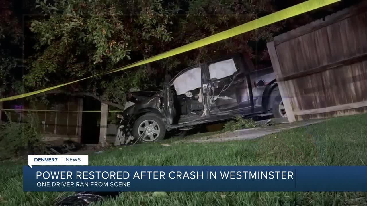 According to the Westminster Police Department, two vehicles crashed in the area of Federal Boulevard and 81st Avenue, and one vehicle struck an electrical box. Police said one of the drivers ran off after the crash and has not been located.