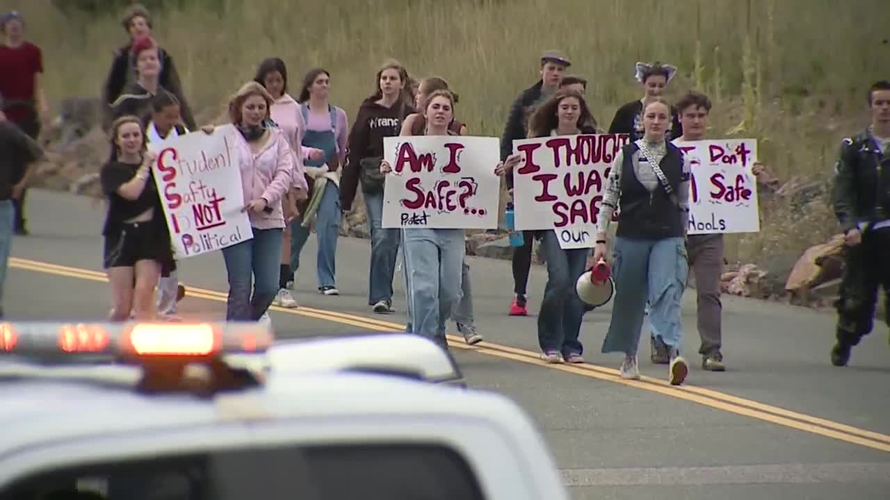Since students from Evergreen HS did not have a classroom to walk out of, their neighbors at Conifer High School invited them to join their protest.