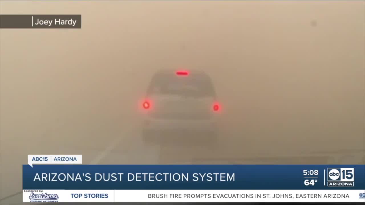 The detection system services a 10-mile stretch of I-10 south of the Valley in an area known for blowing dust and dust storm hazards. It uses visibility sensors to determine the density of dust particles and triggers message boards.