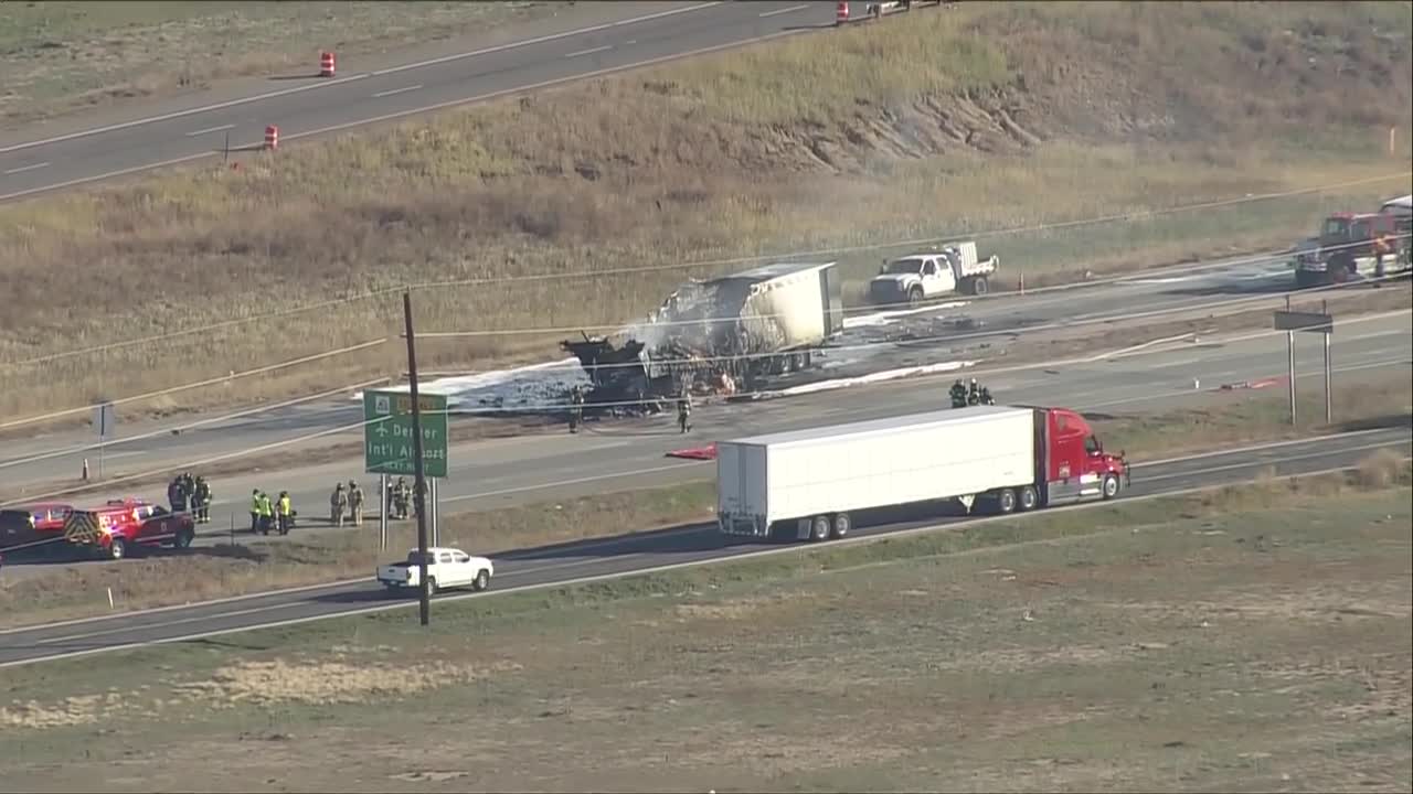 Colorado State Patrol Public Information Officer Trooper Hunter Matthews said a semitruck crashed into a jersey barrier and caught fire. The flames were extinguished by Aurora Fire Rescue, but a large plume of black smoke was visible from CDOT cameras, Jayson Luber reported.