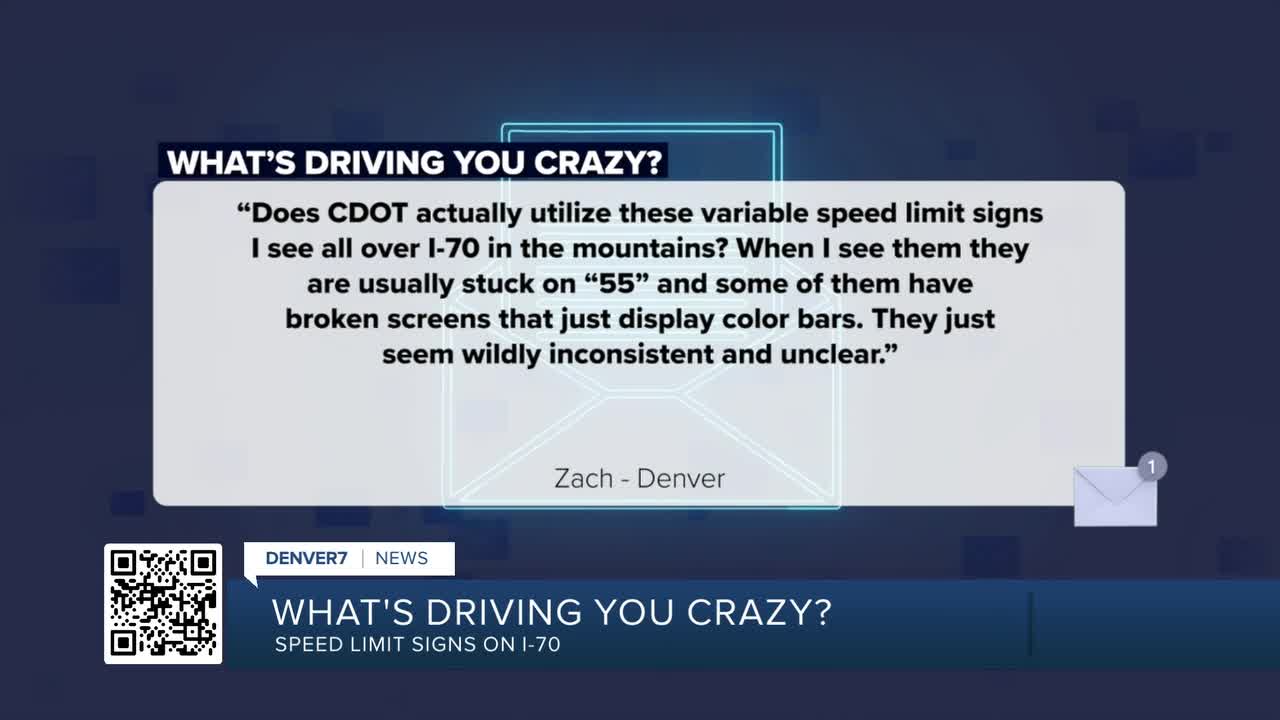 DENVER — Zach from Denver writes, “What’s driving you crazy? Does CDOT actually utilize these variable speed limit signs I see all over I-70 in the mountains? When I see them they are usually stuck on "55" or "test" and some of them have broken screens that just display color bars. They just seem wildly inconsistent and unclear.”