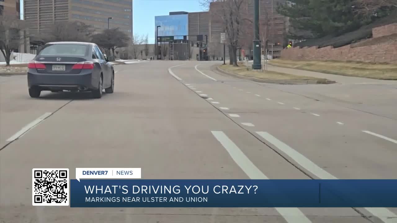 DENVER — Peter from Denver writes, “What’s driving you crazy? Hi Jayson. Near Ulster & Union in the DTC is an odd pavement marking which appears to be used to direct right turning drivers to either the far right or stay away from the bike lane. Is there a definitive reference I can use to interpret the street markings?”