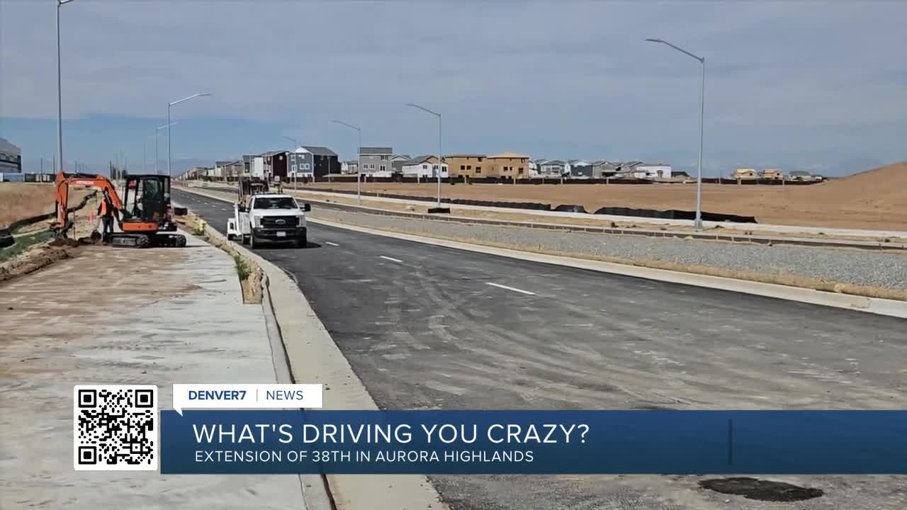 AURORA, Colo. — Jackie from Green Valley Ranch writes, “What's driving you crazy? I work at a school in Aurora Highlands out near DIA. Every day I have to drive south on Piccadilly to E. 26th Ave just to circle back to the Aurora Highlands Parkway. When is E. 38th going to open over the tollway and connect with Aurora Highlands Parkway?”