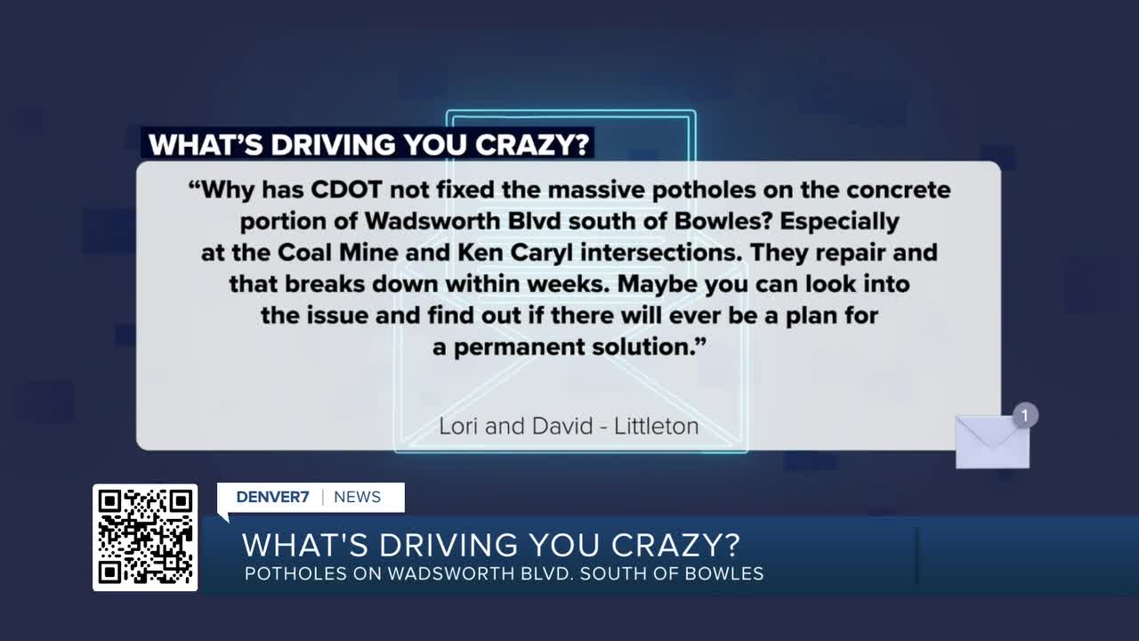 Lori and David from Littleton writes, “What's driving you crazy? Why has CDOT not fixed the massive potholes on the concrete portion of Wadsworth Blvd south of Bowles? Especially at the Coal Mine and Ken Caryl intersections. They repair it and that breaks down within weeks. Maybe you can look into this issue and find out if there will ever be a plan for a permanent solution."