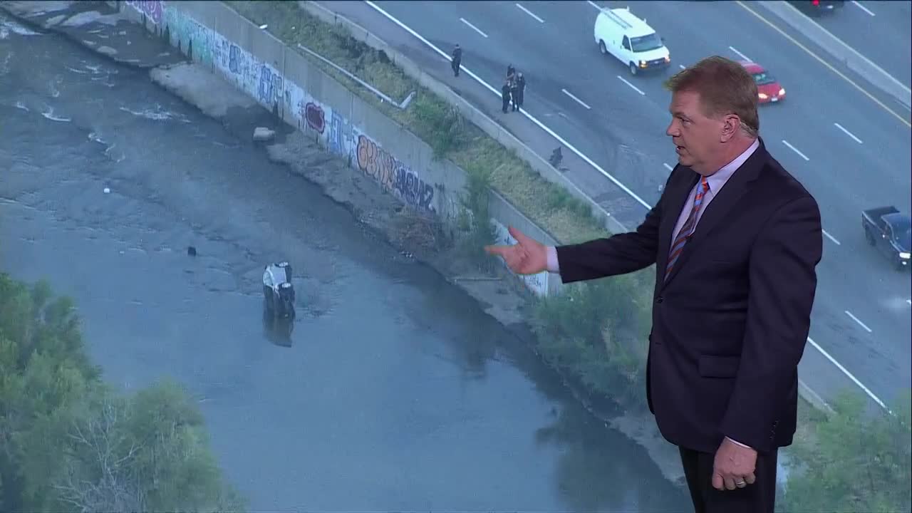 The driver of a red car collided with another vehicle while he was making a lane change on the highway, then both of those vehicles collided with a third car, DPD said. The third car struck the barrier on the right side of the highway, going over the barrier and landing in the South Platte River, according to Denver police.