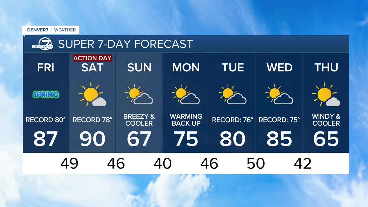 “Saturday will be the hottest and most concerning day, as highs soar to near 90 degrees and winds pick up quite a bit,” according to Denver7 chief meteorologist Lisa Hidalgo. “Humidity levels will drop into the single digits in some areas, so it'll be a bone-dry day.”