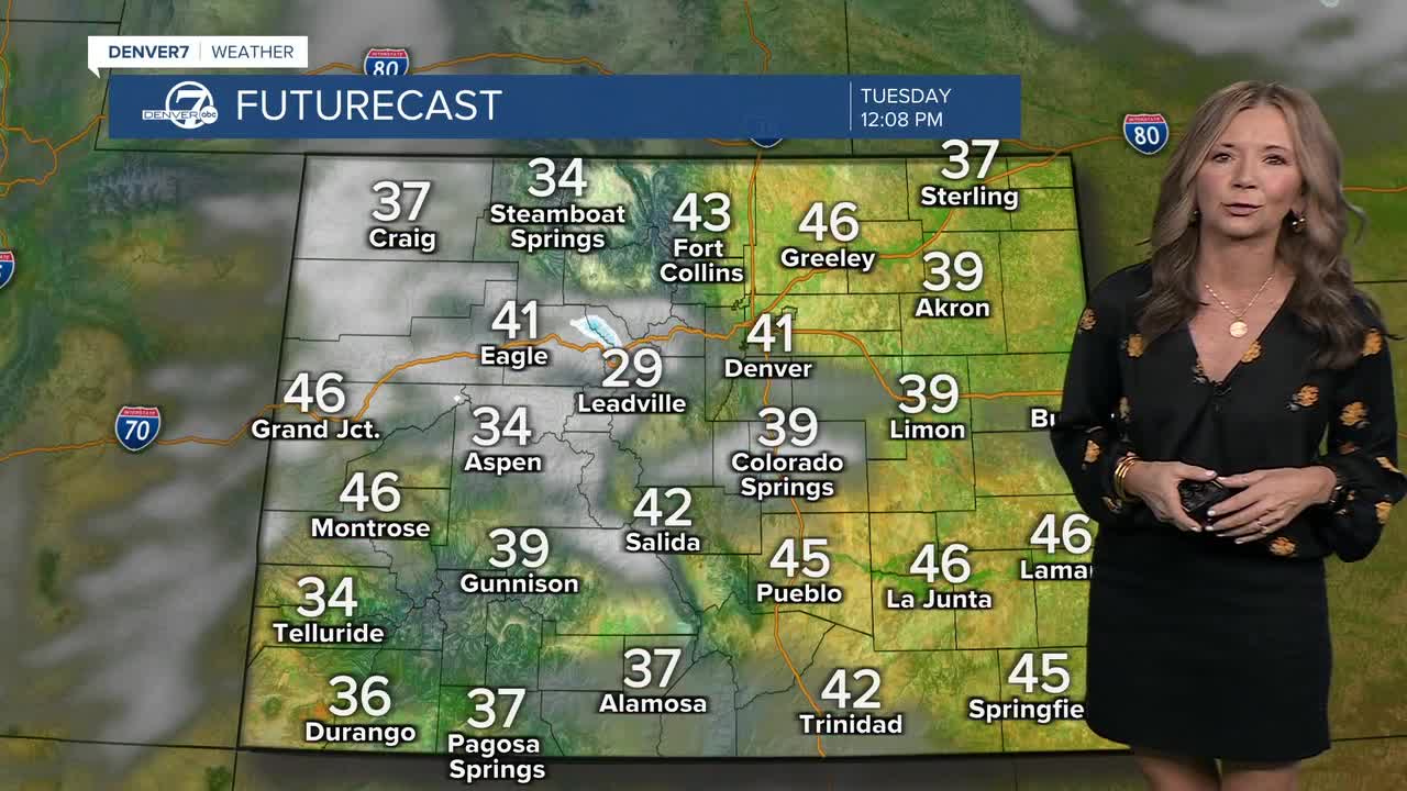 Tuesday will be colder behind the front, with high temperatures only reaching the low to mid 40s. Snow will taper off in the mountains, with more sunshine by Tuesday afternoon. Temperatures will tank overnight, with lows in the teen and and 20s along the Front Range early Wednesday.