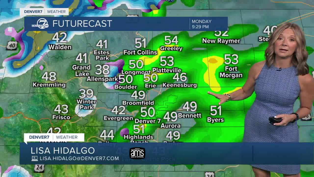 A cold front will roll through early Monday, increasing the winds and ushering in some much cooler weather. We'll see high temperatures in the low to mid 50s across the northeastern plains, with 40s in the mountains. By the afternoon and evening, scattered showers and a few thunderstorms are expected to redevelop, especially along the foothills and northeastern plains.