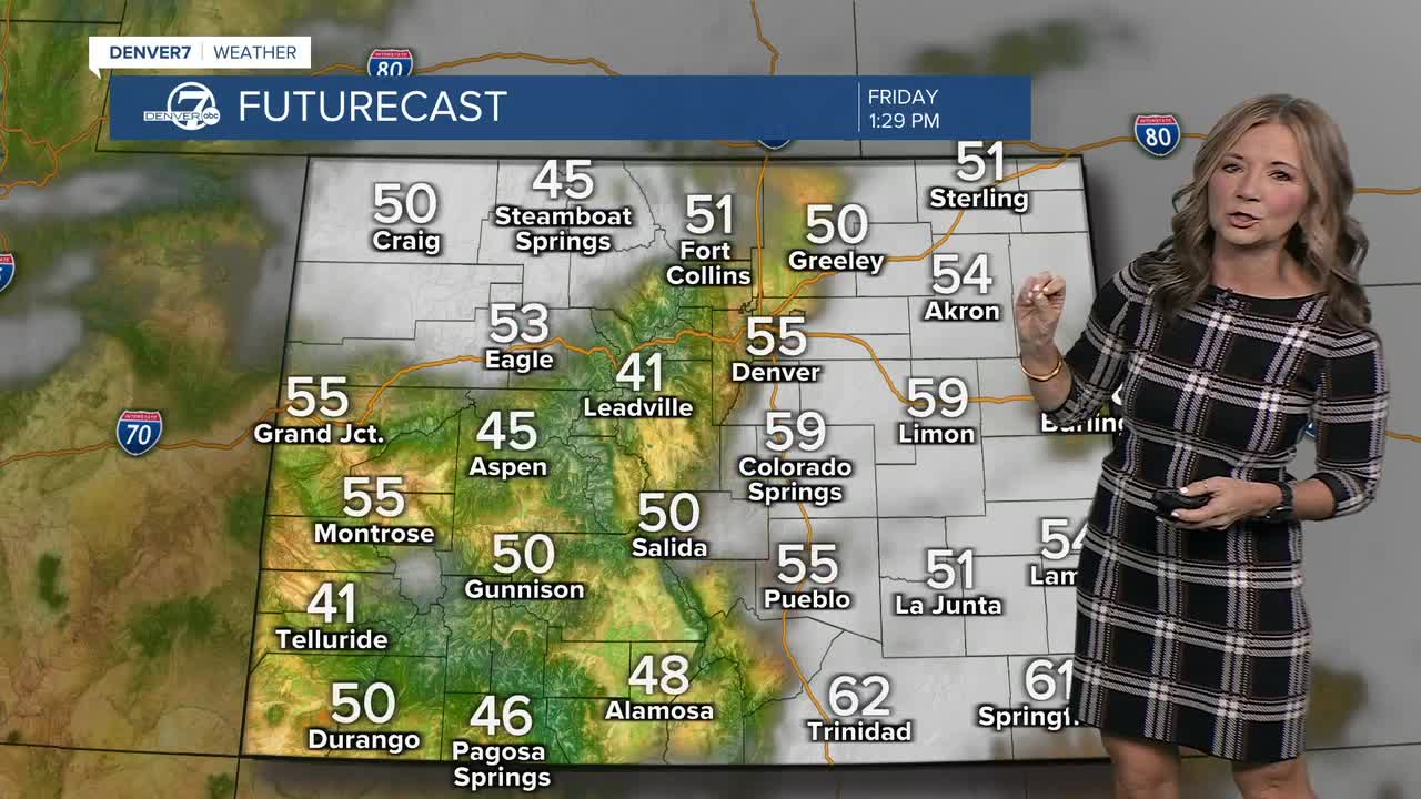 Mostly sunny in the mountains, with upper 30s to low 40s! Friday will be even a little warmer. We'll see increasing clouds across the plains but temperatures will climb into the upper 50s to even a few low 60s Friday afternoon. The winds will kick up across Colorado ahead of our next cold front.