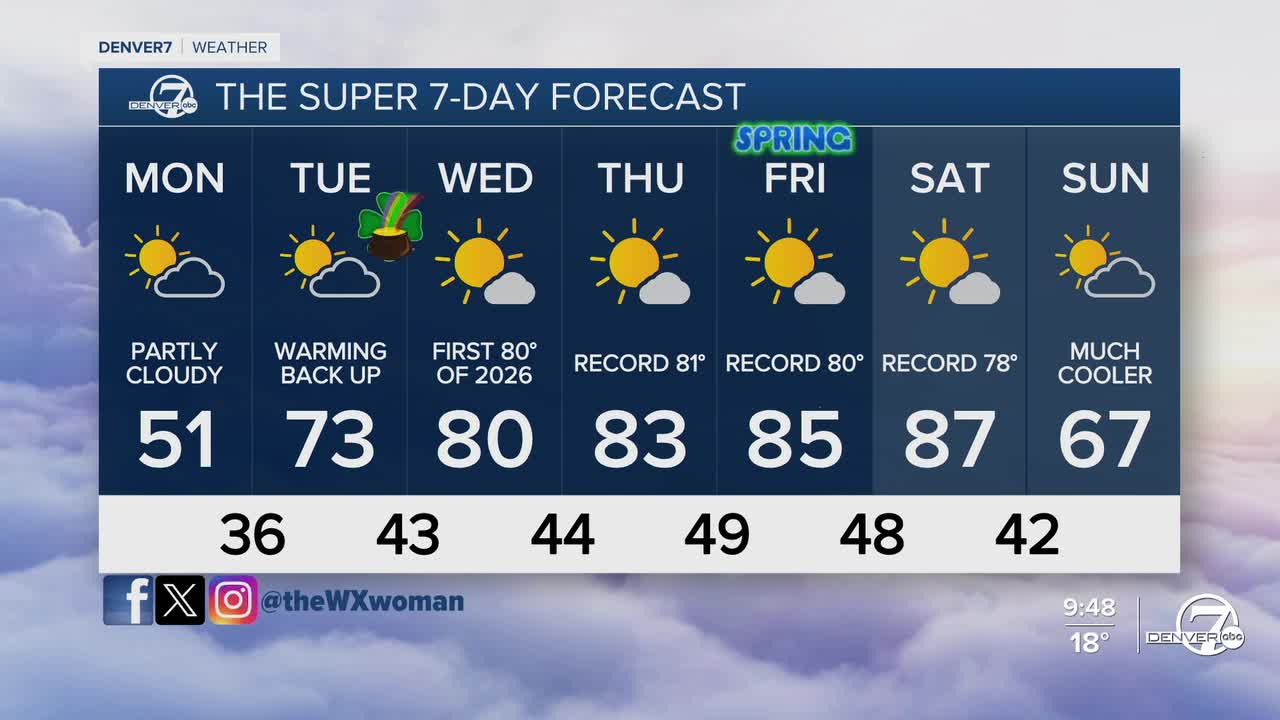 After a chilly start to your Monday, look for partly sunny skies and seasonal afternoon highs in the low 50s. The March-like weather won't last long as we're expecting a potential historic heat wave to move into Colorado starting Wednesday.