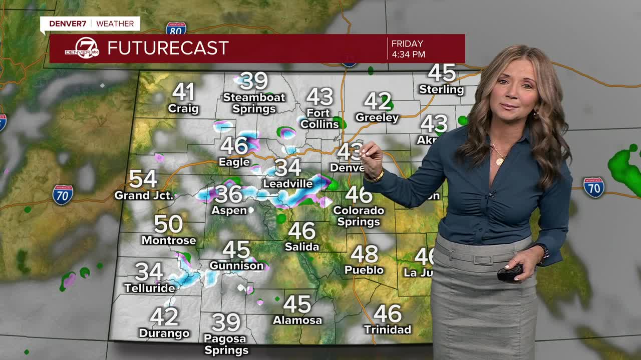 DENVER — It's a chilly and wet start to the day, with a few lingering showers across the northeastern plains. We'll see a chance of light rain in Denver and some wet roads for the Friday morning commute. We saw some light snow in the mountains, but it was just too warm in town to see our first snow of the season.