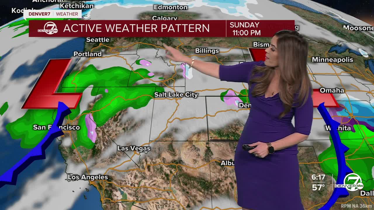 By Sunday, cooler air settles in behind a cold front, with highs returning to the lower 60s across northeast Colorado. We'll see more cloud cover across the state, with higher humidities. The best chance for precipitation will be across the northern mountains, where light snow is possible. At this time, look for just a few inches of new snow as impacts should be limited. There will be a chance of spotty showers across the plains late Sunday night into Monday.