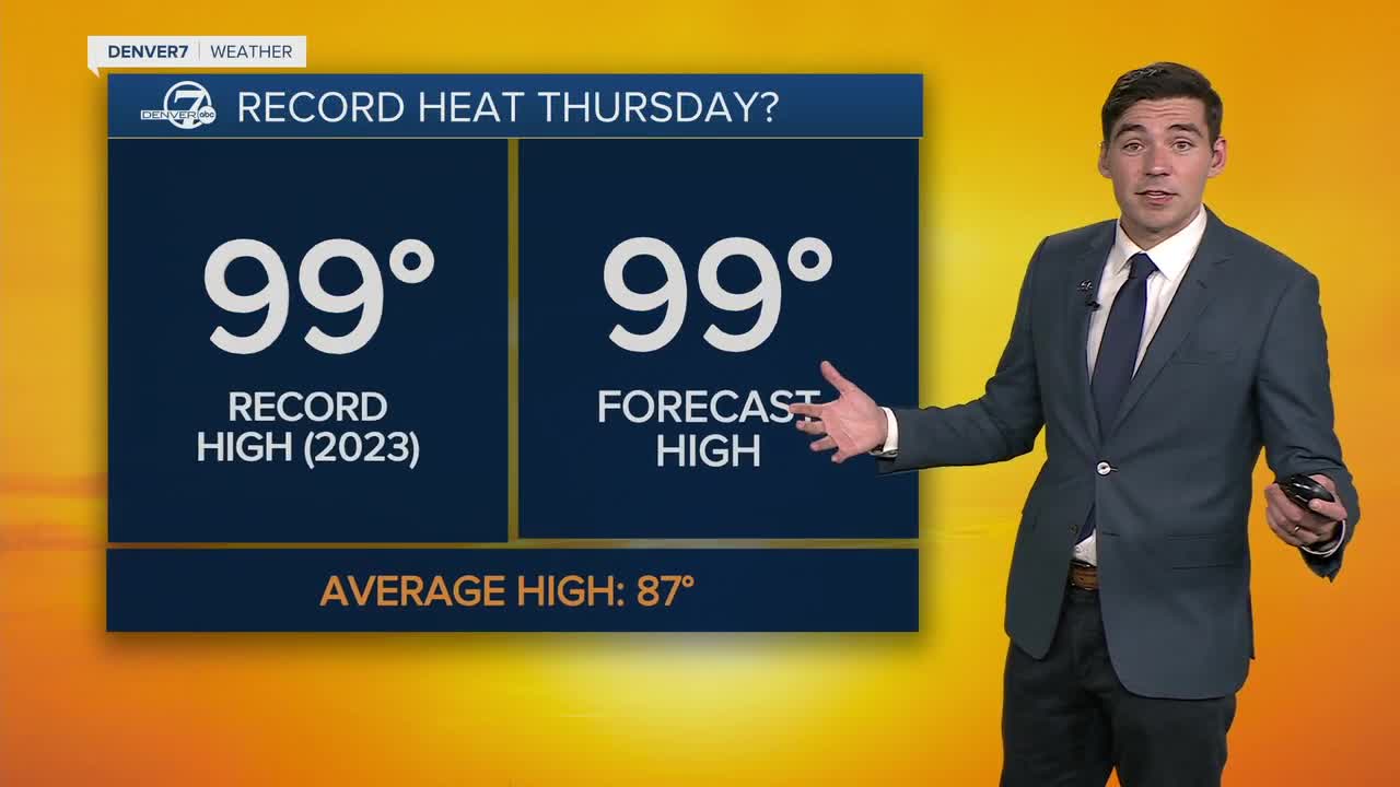Wednesday is shaping up to be an even hotter day, and Thursday could bring record heat to Denver. The daily record set in 2023 is 99 degrees, and Thursday could match or even beat that mark. Storm chances the next couple of days will be minimal.