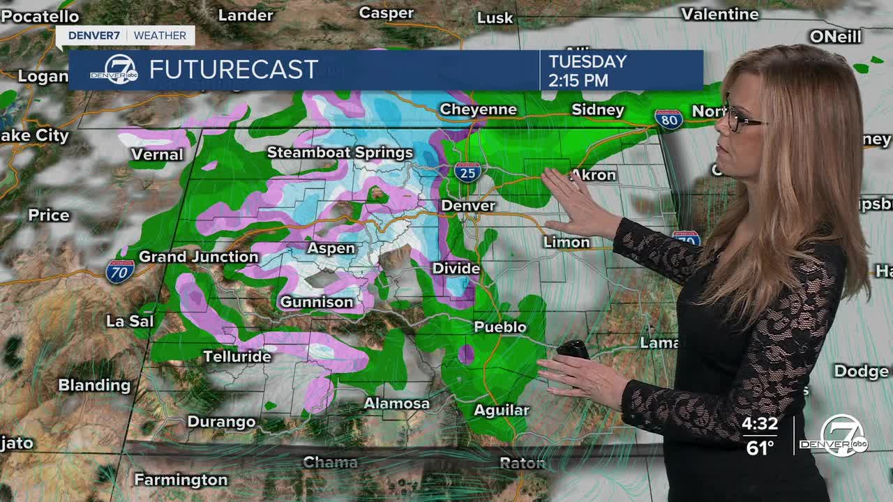 Clouds will increase Monday night as the next system moves in. Snow showers are likely in the mountains overnight, and there’s a strong chance that we’ll see measurable snow in the mountains by Tuesday. The best chances look to be north of Interstate 70, where the storm track is expected to focus most of the moisture.