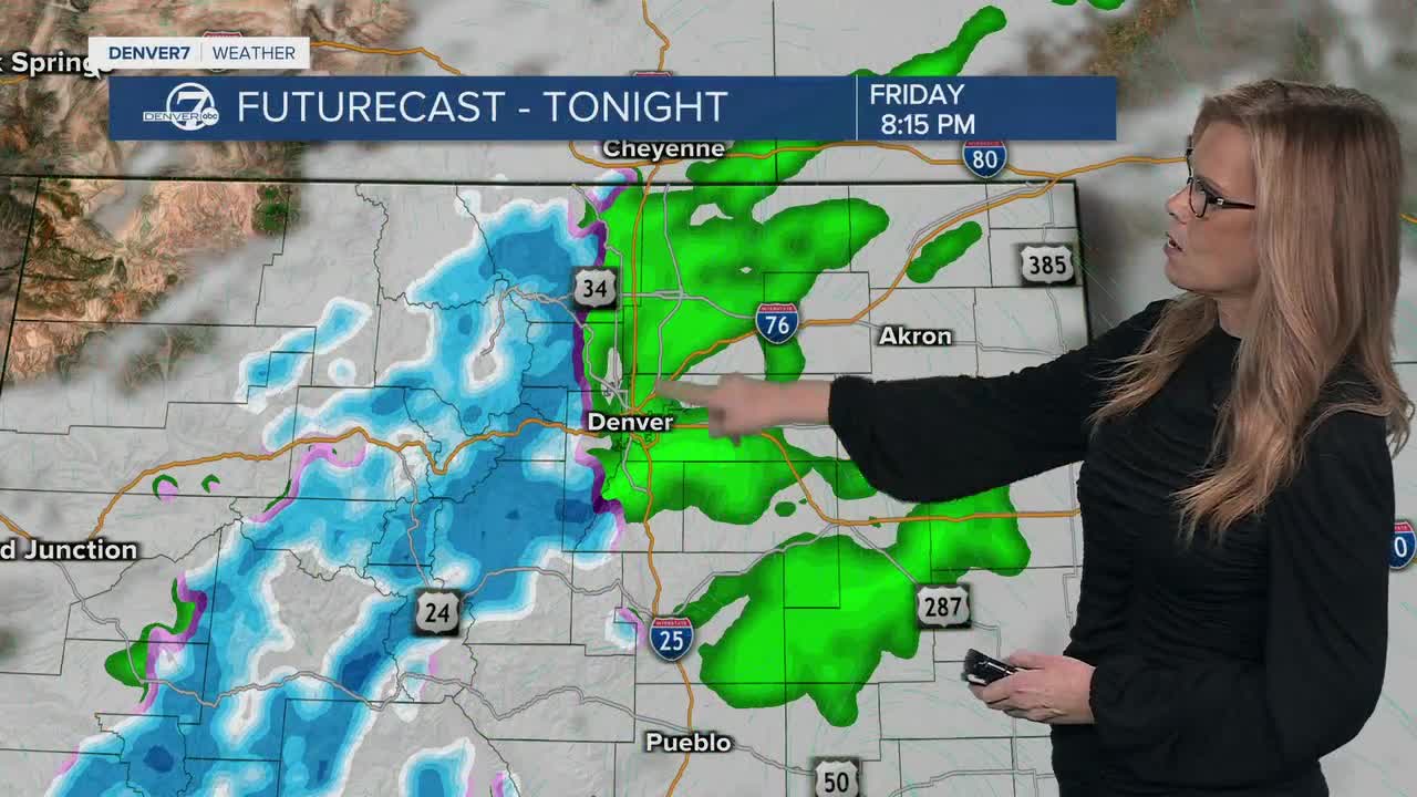DENVER — Tonight, we’re tracking a quick burst of winter weather in the mountains. Snow will continue through the evening, especially along the I-70 mountain corridor. Travel will get tricky for a few hours, with periods of moderate to heavy snow and totals around 4 to 8 inches by early Saturday. If you’re heading up into the high country this evening, plan for winter driving conditions. Leave extra early on Saturday morning if you're looking to ski the fresh powder. Meanwhile, across the plains, it’s a much different story with light rain moving in. Some areas could see a decent soaking, but temperatures will stay warm enough to keep it mainly rain outside of the higher foothills.