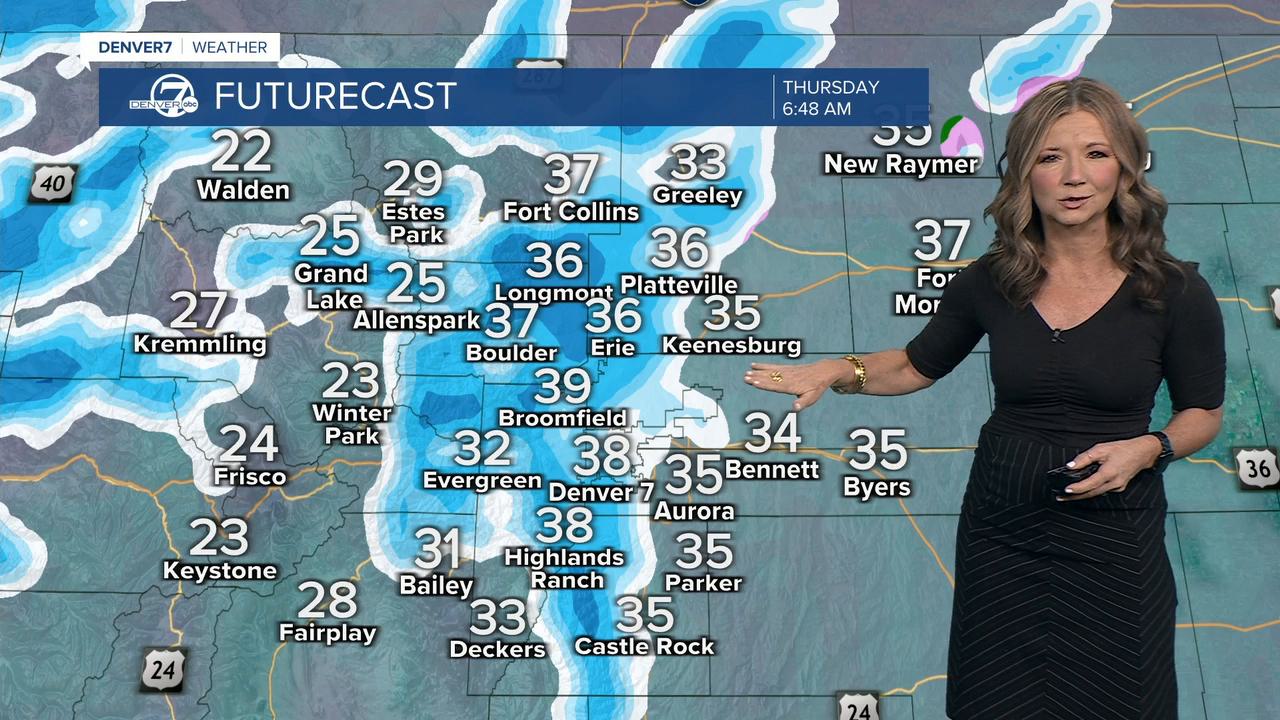 We'll see mostly sunny skies to start, with increasing clouds and highs in the upper 50s to low 60s across the Eastern Plains. Snow will develop in the mountains Wednesday night. That snow will spread east and we could even see a light rain/snow mix for the Thursday morning commute. We'll likely see a heavier round of snow Thursday afternoon into Thursday evening.