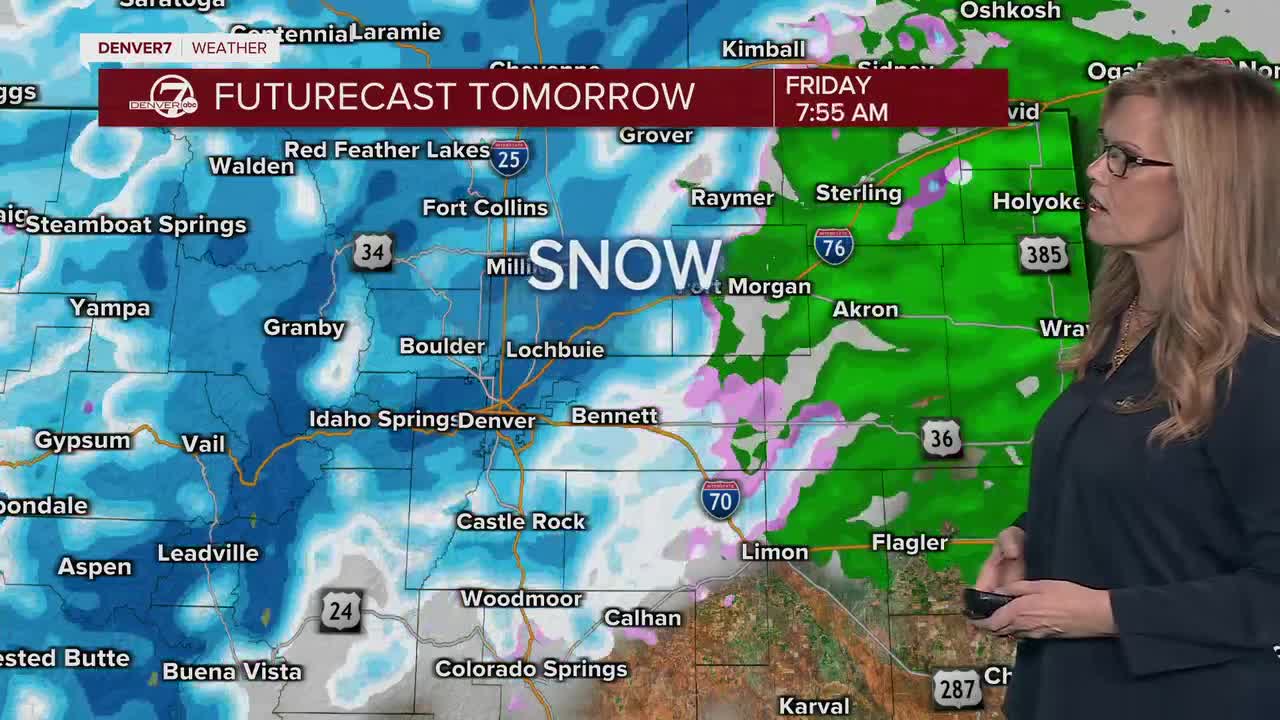 DENVER — Late tonight, a powerful winter storm will swing into Colorado ushering in heavy mountain snow and a bit of a rain/snow mix to the Interstate 25 corridor and plains. So far, it looks like it'll be a slushy and snowy Friday morning (and evening) drive across the city with possibly 1 to 3 inches of accumulation in Denver. We'll see some slightly heavier accumulation along the Palmer Divide and west up into the foothills.