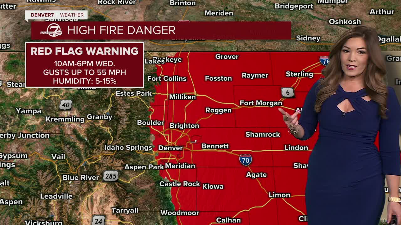 High fire danger continues to be top of mind with the recent bone dry conditions and above-average temperatures. A Red Flag Warning goes back into effect at 10am until 6pm Wednesday for gusty winds up to 55mph, warm 60+ degree temperatures and low humidity values between 5 and 10 percent.