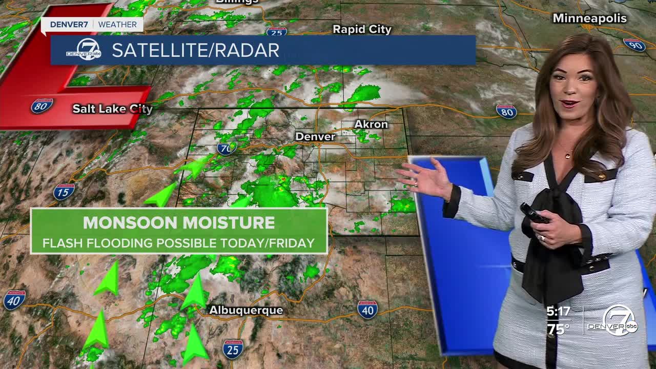 DENVER — The monsoon moisture makes a comeback for much of the Western Slope along with the central and southern mountains this evening into Friday. A Flood Watch is in effect until midnight Friday for the potential of flash flooding. Some areas could see 1-2 inches of rain from slow-moving thunderstorms.