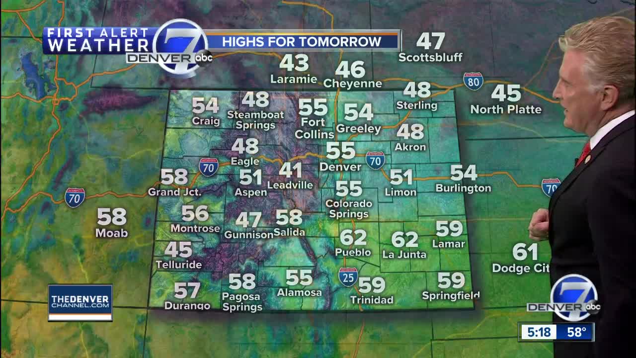 A cold front will move through the state tonight and early Wednesday with cooler temperatures and gusty winds. Denver and the plains will stay dry, but winds will be strong from the northwest on Wednesday with speeds of 15 to 35 mph. Highs will be in the low to mid-50s in Denver, with mid to upper 40s over northeastern Colorado. The wind will make it feel colder!