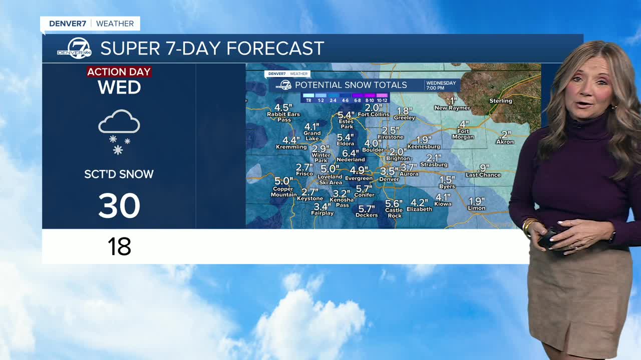“Snowfall totals could be around 2 to 5 inches here along the Front Range and across the Denver metro area,” said Denver7 chief meteorologist Lisa Hidalgo. “Some of those heavier totals will likely be south along the Palmer Divide and also on the west side of town and up into the foothills.”
